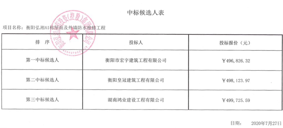 衡陽(yáng)弘湘A1棟屋面及外墻防水維修工程中標(biāo)候選人公布