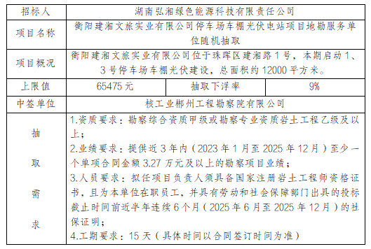 衡陽建湘文旅實業(yè)有限公司停車場車棚光伏電站項目勘察服務隨機抽取結果公示