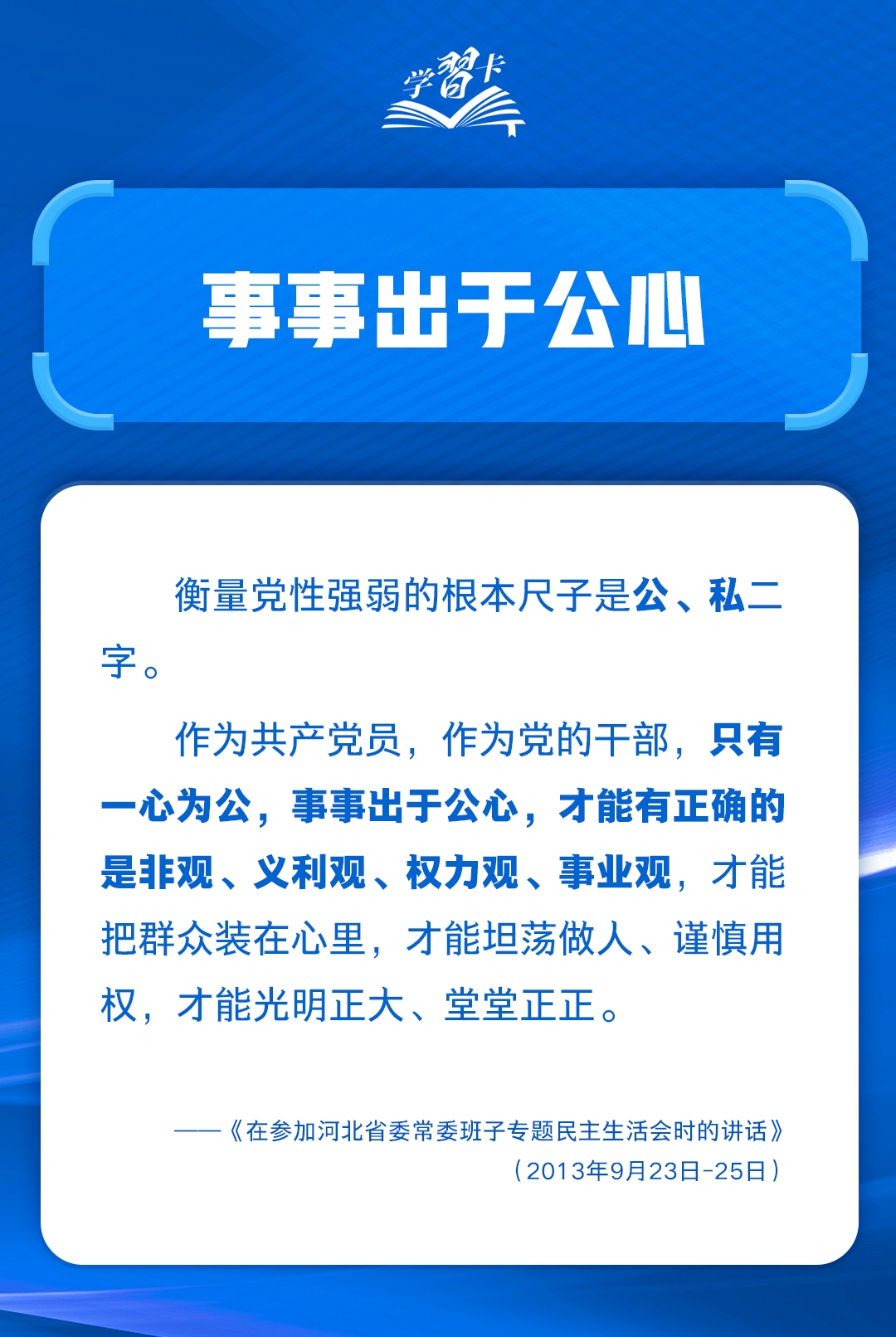 樹立和踐行正確政績(jī)觀,起決定性作用的是黨性。立黨為公,作為共產(chǎn)黨員,作為黨的干部,只有一心為公,事事出于公心,才能有正確的是非觀、義利觀、權(quán)力觀、事業(yè)觀。